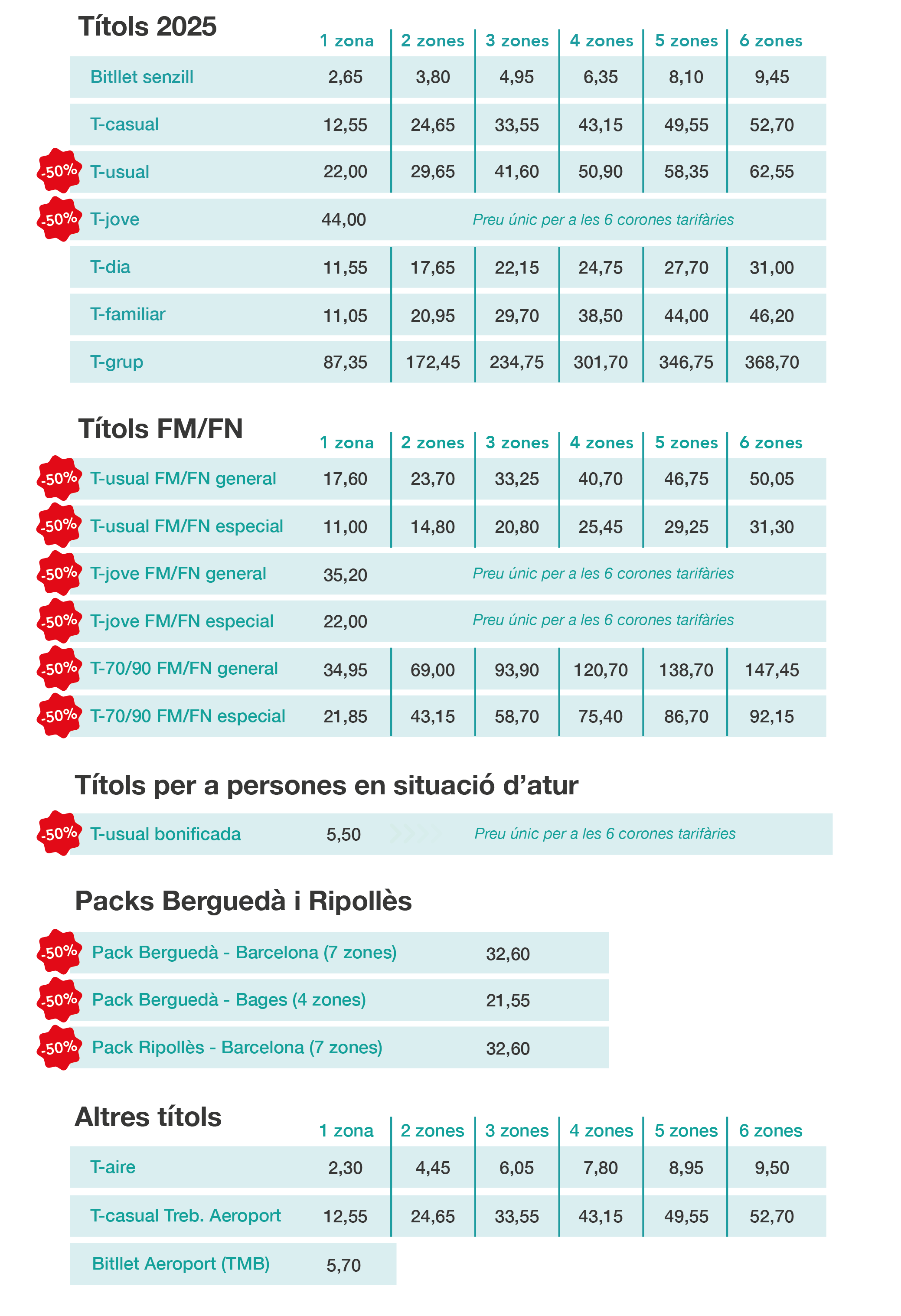 L’ATM de Barcelona ha acordat en Consell d’Administració extraordinari mantenir els descomptes del 50% en els abonaments T-jove i T-usual. Aquestes bonificacions per a l’exercici 2025 s’aplicaran també a les versions d’aquests abonaments per a famílies Monoparentals i Nombroses, per a persones en situació d’atur i en els packs especials del Sistema Tarifari Integrat ampliat (Berguedà i Ripollès). Pel que fa al preu general de les tarifes, s’ha acordat una actualització  del 3%.