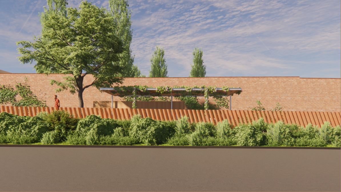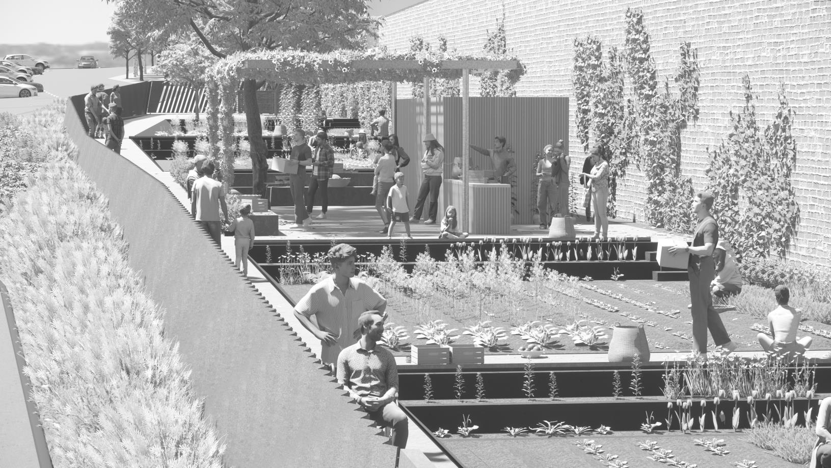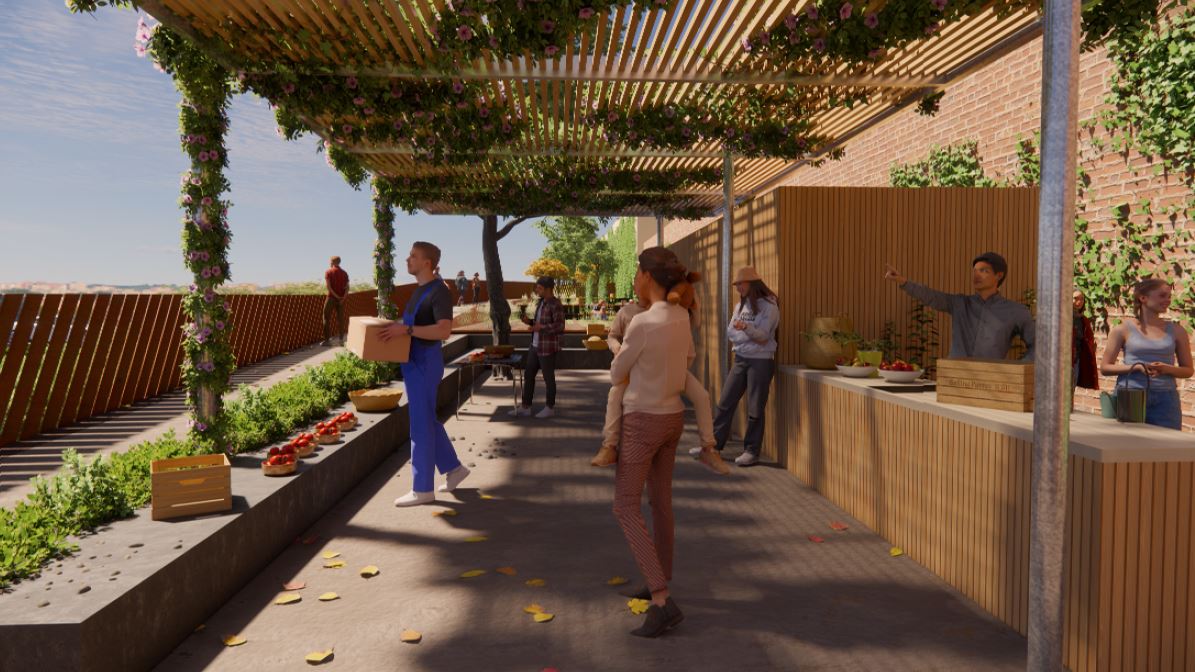 A la plataforma central s’integrarà una pèrgola que compleix diverses funcions: estructurar visualment l’espai, oferir ombra i servirà de suport per al creixement d’una parra, afegint un component natural i productiu al conjunt.