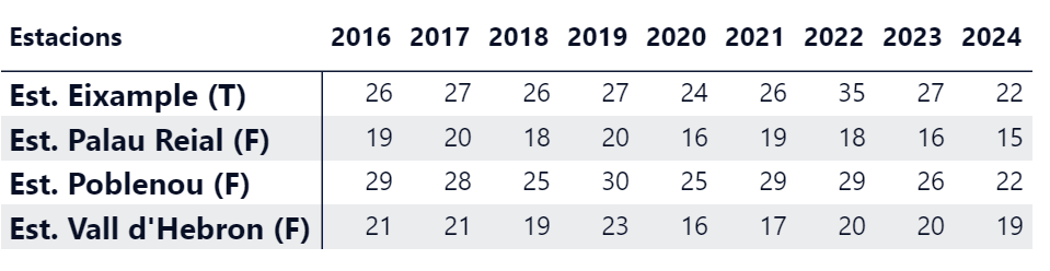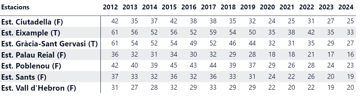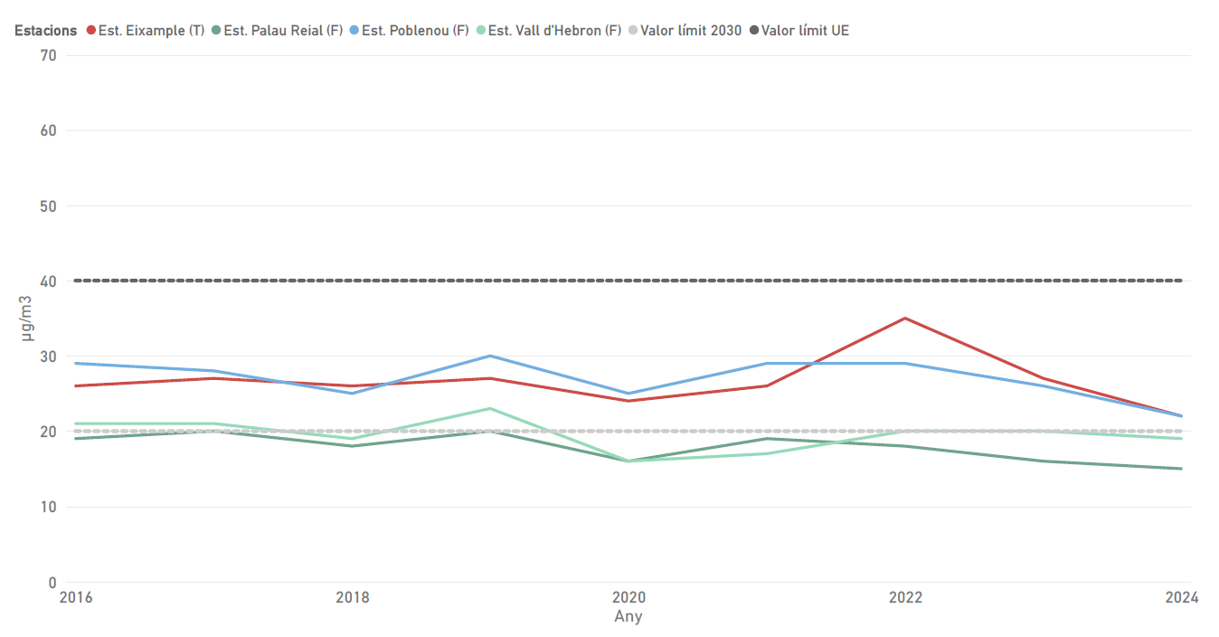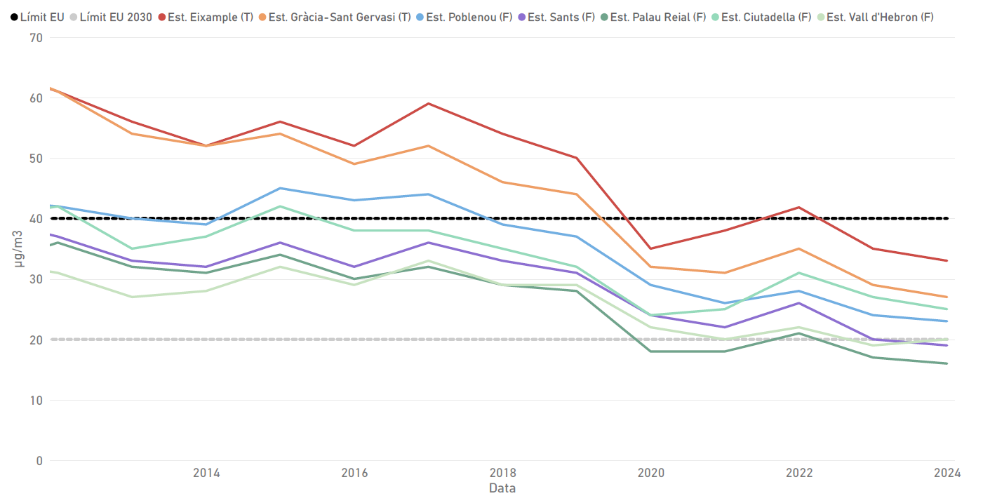 Les estacions de la Xarxa de Vigilància i Previsió de la Contaminació Atmosfèrica de la ciutat han complert, el 2024, el valor límit vigent que marca la Unió Europea. Totes les estacions, tant de trànsit com de fons, han registrat una davallada o s’han mantingut respecte a les dades de l’any anterior i consoliden la tendència descendent dels últims anys.