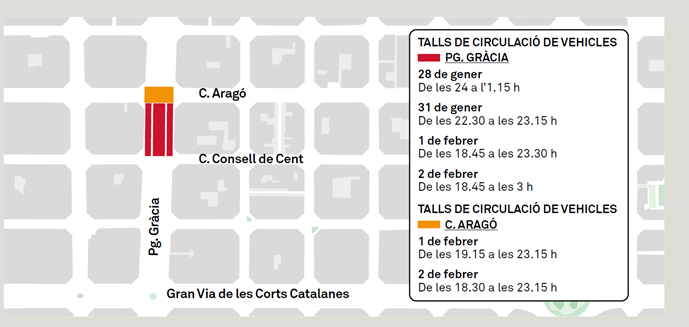 - El cap de setmana de l’1 i el 2 de febrer, coincidint amb la projecció, es produiran talls de circulació al passeig de Gràcia, en el tram comprès entre Aragó i Consell de Cent, que afectaran també el carrer Aragó