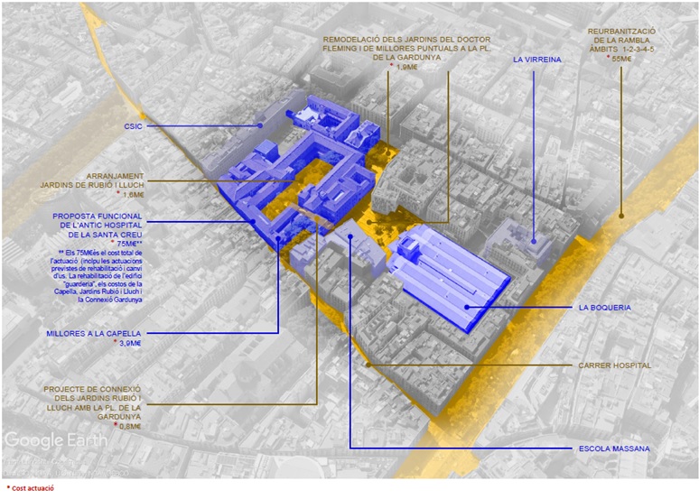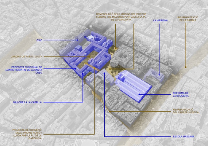 Totes aquestes actuacions contribuiran a generar un nou espai a l’entorn de l’Antic Hospital de la Santa Creu, amb nous espais i equipaments públics i la remodelació dels existents. Formen part de l’actuació del Govern municipal que prioritza les actuacions urbanístiques i la dinamització dels eixos al Raval Nord al voltant de la plaça de Castella, la plaça dels Àngels, la plaça de la Gardunya, Can Seixanta i la Rambla del Raval.