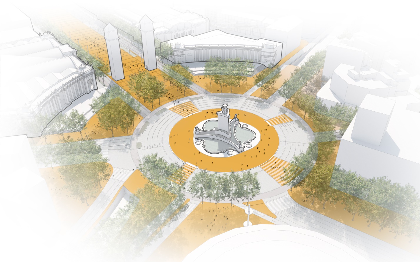 Aquest eix connectarà tots els costats amb el centre de la plaça, que tindrà una nova vorera al voltant de la font, a la qual es podrà accedir des dels nous passos de vianants. La transformació de la plaça, a més, incorporarà verd al seu entorn i estarà plenament integrada amb la xarxa de transport públic.