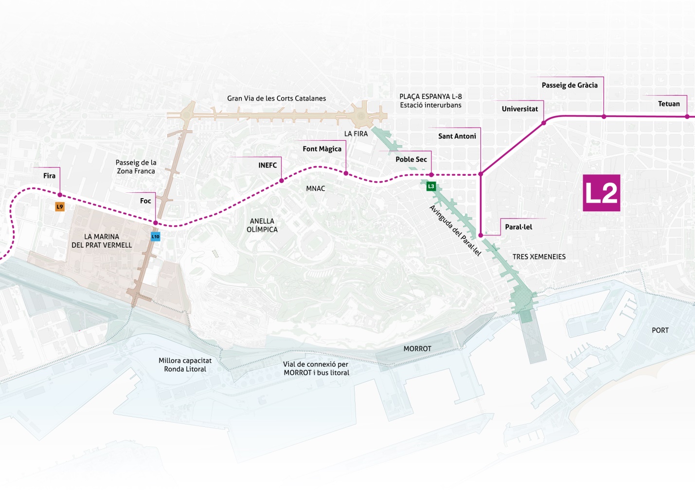 L’ampliació de l’L2 fins a Montjuïc serà un punt clau per a la culminació d’aquesta gran transformació i facilitarà l’accés a l’Anella Olímpica, al MNAC i al conjunt de la muntanya i alhora fomentarà una mobilitat més sostenible.