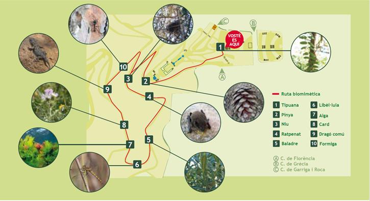 Es tracta d’un conjunt de plafons informatius que configuren un recorregut pel parc mitjançant el qual la persona visitant pot conèixer les innovacions nascudes de l’estudi de la natura i l’aplicació que tenen en el món de l’arquitectura, l’enginyeria o la indústria. A l’inici del recorregut hi ha un primer senyal amb un mapa descriptiu del circuit. El circuit conté 10 senyals que identifiquen 10 models biològics amb les seves respectives innovacions biomimètiques.