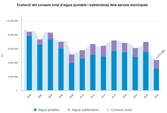 De fet, l’any 2024 el 51,75% del consum total dels serveis urbans i de manteniment de l’espai públic ha estat d’aigua freàtica.