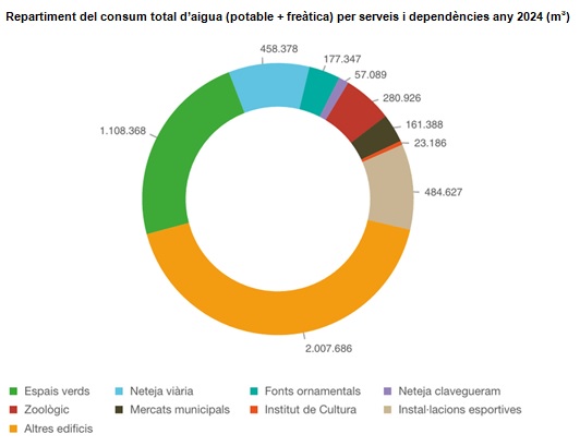 Els serveis municipals que fan més consum d’aigua són els edificis municipals, el reg dels parcs i els jardins, la neteja viària, i altres com el Zoo, els mercats municipals o la neteja de carrers. Entre els serveis urbans, aquest 2024, ateses les restriccions per sequera, els consums s’han repartit d’aquesta manera.