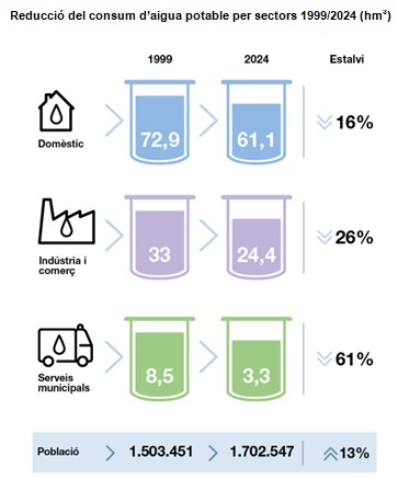 Si comparem els consums amb els de fa 25 anys, les dades mostren com es consumeix un 22% menys d’aigua mentre que la població ha augmentat un 13%.