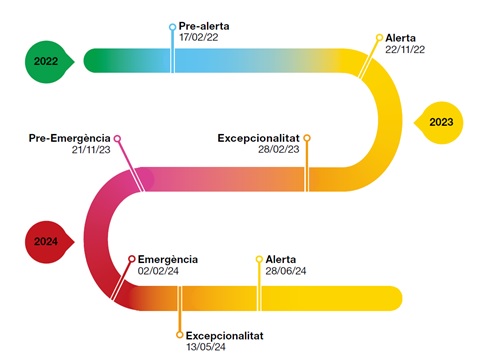 A Barcelona es va entrar en alerta per sequera el mes de novembre de 2022. Des d’aquell moment i fins ara, s’han mantingut les restriccions en l’ús de l’aigua, sempre d’acord amb la fase vigent. Des del mes de juny passat, moment en què la Generalitat va flexibilitzar les mesures, Barcelona es troba de nou en fase d’alerta.