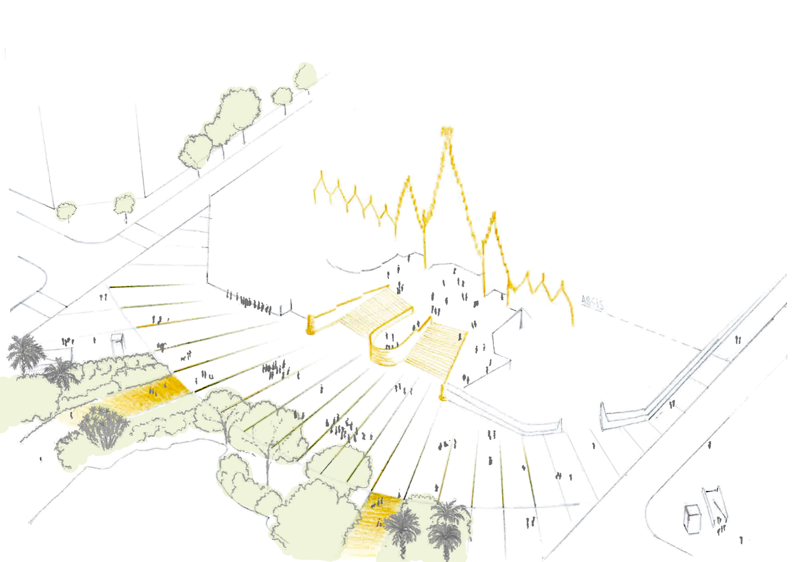 - La idea de projecte neix d’una traça circular proposada per Rubió i Tudurí el 1977 per l’actual plaça Gaudí, i que relliga el nou espai amb les preexistències actuals