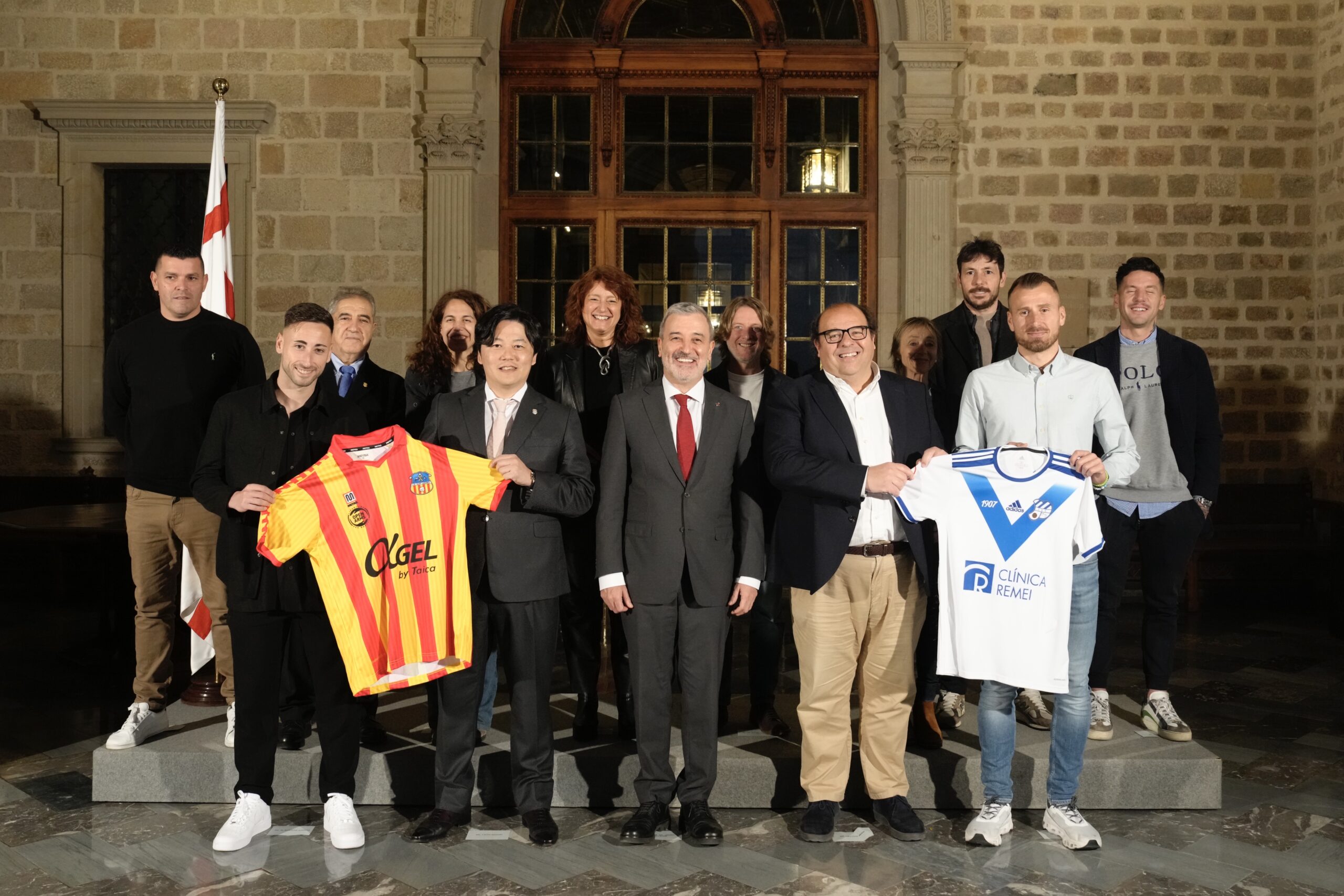 Jaume Collboni rep representants de la U.E. Sant Andreu i el C.E. Europa abans de la disputa del derbi