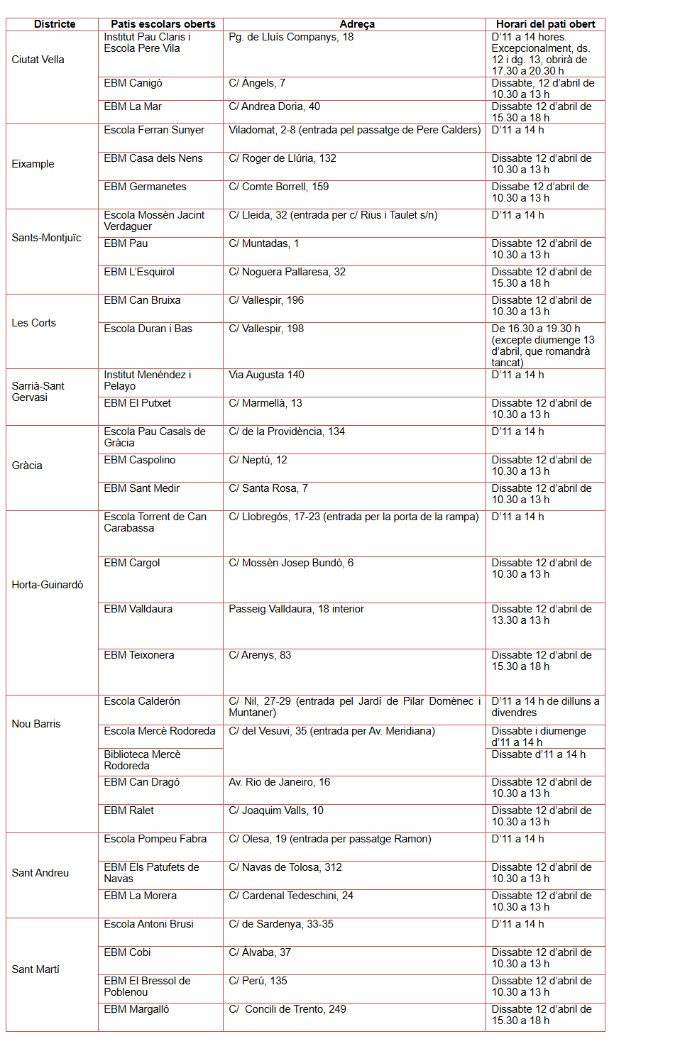 - Obriran des d’avui dia 12 fins al 21 d’abril en diferents horaris de matí i de tarda, i en el cas de les escoles bressol per a mainada fins als 6 anys acompanyada de la família