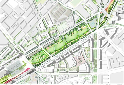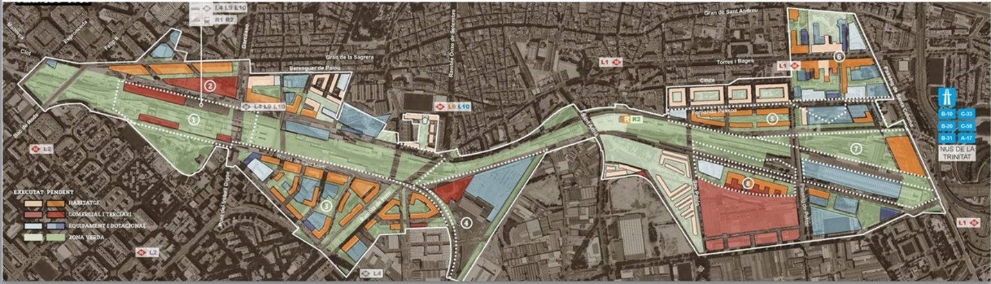 El projecte de la Sagrera és la transformació urbana més important i de més abast de la ciutat, amb el principal intercanviador modal de transport interurbà, amb l’equivalent a una futura població resident de fins a 30.000 habitants, la generació d’uns 15.000 nous habitatges, 500.000 m2 de sostre d’activitat terciària, i un parc lineal de quasi 4 km. sobre les lloses ferroviàries, a més de zones verdes de proximitat als nous teixits residencials.