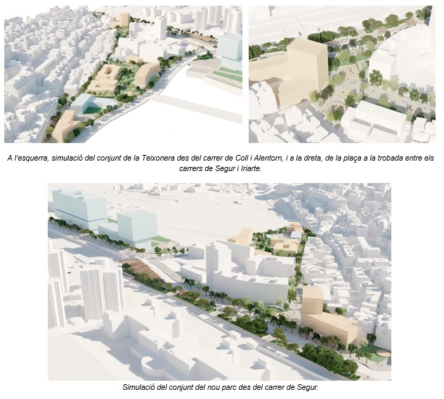 - Els espais lliures i zones verdes superen els 24.000 m²: es crea un nou parc que facilita la transició entre la Teixonera i el carrer de Coll i Alentorn, apareix una nova plaça a l’encreuament entre les Escales dels Canadencs i el carrer de Segur, s’amplia la plaça d’Isop i s’integra la nova zona verda de la futura cobertura de la ronda de Dalt