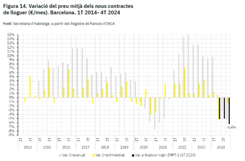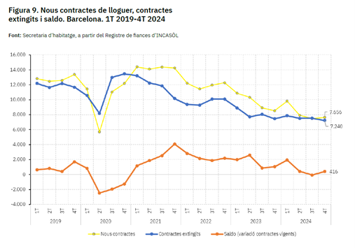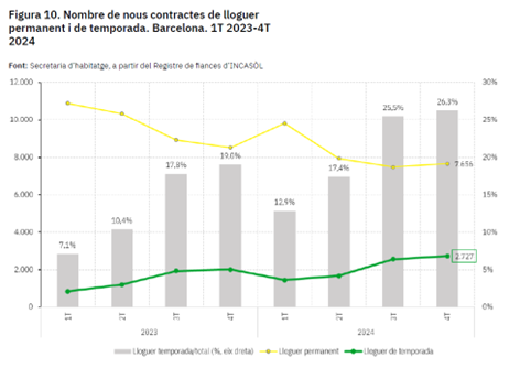 L’informe destaca que, davant la nova regulació, una alternativa al mercat de lloguer residencial permanent ha estat el mercat de lloguer de temporada, que ha seguit una evolució a l’alça des del primer trimestre de 2023. Durant el quart trimestre de l’any 2024, s’han signat un total de 2.727 nous contractes de lloguer de temporada, cosa que representa un 26,3% del total de nous contractes de lloguer signats a Barcelona. El document associa aquest increment tant a l’efecte de la regulació del preu de lloguer residencial com al major atractiu de Barcelona com a ciutat per a estades temporals o de curta durada arran de les noves dinàmiques demogràfiques i laborals associades al nomadisme digital, així com a la pròpia naturalesa del contracte de temporada, el qual per la seva menor durada, implica més moviment de extincions i noves contractacions.