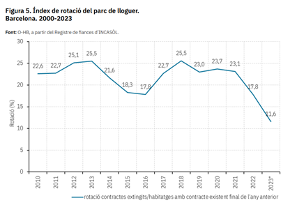 L’informe relaciona el creixement de l’estabilitat de les llars, i el conseqüent descens en la rotació del parc en lloguer, a l’allargament de la durada mínima dels contractes de lloguer d’habitatge de 3 a 5/7 anys introduïda en la modificació de la LAU el 2019, incrementat l’estabilitat residencial de les llars.