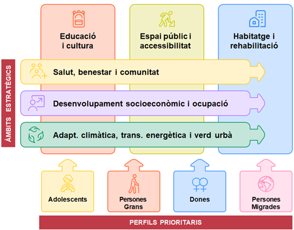 Aquesta nova edició del Pla de Barris presenta una redefinició pel que fa als eixos prioritaris d’intervenció. També en relació als àmbits estratègics d’actuació, i als perfils prioritaris.