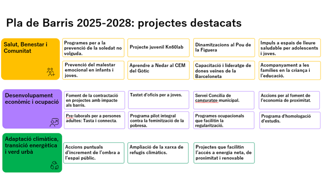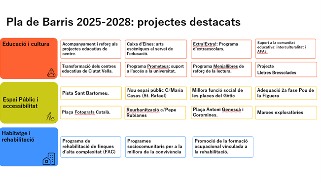 En aquesta nova etapa, es reforcen projectes i actuacions de les anteriors edicions que continuen vigents, i que ara prendran forma també en la resta de barris que s’incorporen al pla. A més, s’afegiran noves estratègies i nous projectes, apostant una vegada més per la innovació de polítiques públiques transformadores que busquen reduir les vulnerabilitats urbanes, coherent amb l’acció del Govern municipal per aquest mandat també a través del Pacte per Ciutat Vella i l’abordatge integral de les polítiques de transformació al districte per als propers anys.