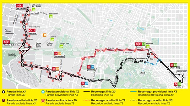 - La nova línia X3 es posarà en marxa el dilluns 26 i anirà des del Paral·lel fins a l’Avinguda Carrilet fent un recorregut similar al que tindrà la línia 2 del metro quan estigui ampliada: tindrà parades a l’Anella Olímpica, el carrer Foc i la Fira
