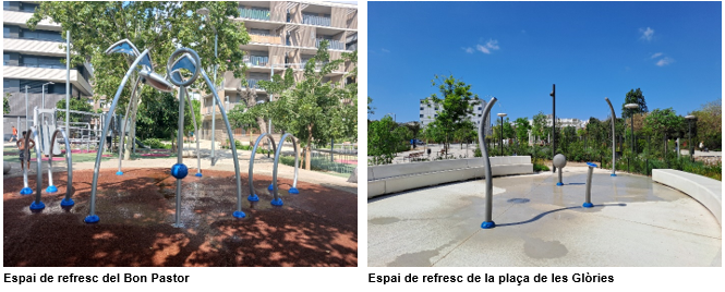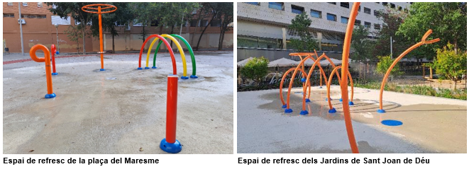 - Aquest estiu s’obren quatre nous espais amb jocs d’aigua als Jardins de Sant Joan de Déu, a les Corts, a la plaça de les Glòries, a la plaça del Maresme i a la Casa de l’Aigua de la Trinitat Vella, que se sumen als quatre existents fins ara a la ciutat