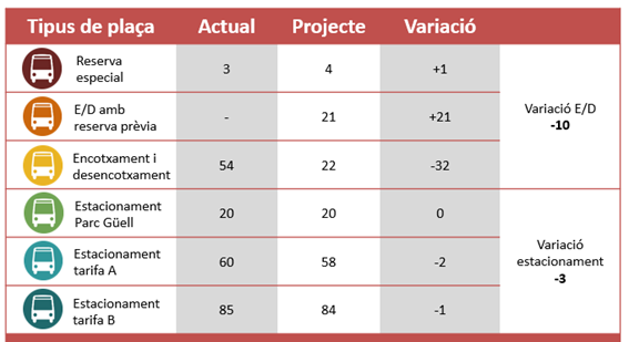 En paral·lel, la reorganització del nombre i la ubicació de les places d’aparcament suposarà una reducció total de 13 places respecte al nombre actual: 10 places menys d’encotxament o desencotxament i tres places menys d’estacionament. Les places quedaran distribuïdes de la següent manera: