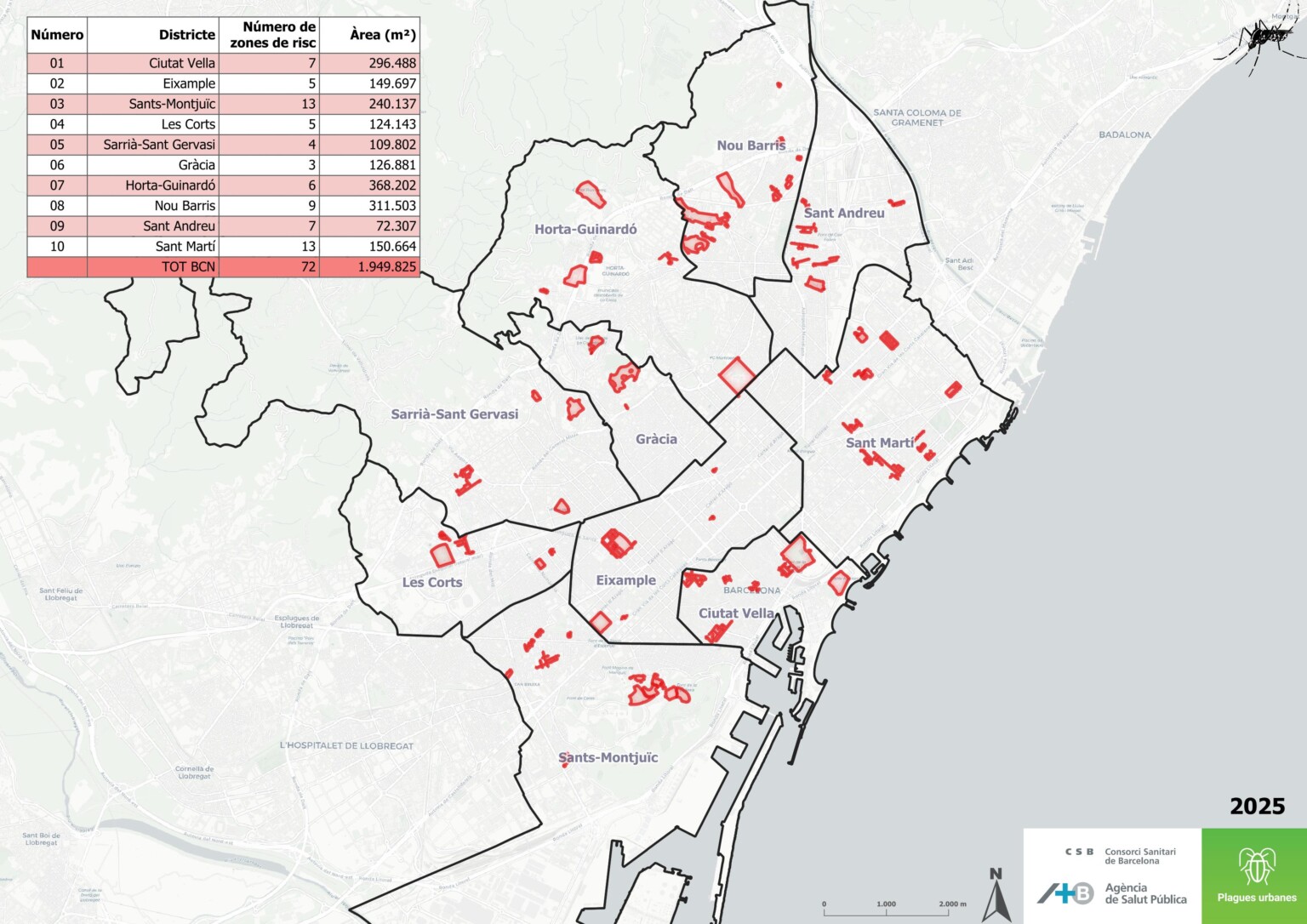 L’Agència de Salut Pública de Barcelona (ASPB) identifica cada any els espais públics de la ciutat amb elements de risc on potencialment poden proliferar els mosquits amb l’objectiu principal d’eliminar punts de cria i evitar la seva presència per reduir els riscos per a la salut de les persones, especialment en el cas del mosquit tigre. Des d’abril a novembre s’intensifica la vigilància i prevenció en aquests espais i s’intervé on se’n detecta activitat. El mapa de zones de risc s’elabora tenint en compte l’activitat registrada l’any anterior, els elements de risc, els equipaments especialment sensibles pel que fa a la vigilància i control d’arbovirosis i altres aspectes relacionats amb l’entorn i les desigualtats socials. Enguany se n’han definit 71. D’altra banda, s’atenen les comunicacions ciutadanes relacionades amb la presència de mosquits, es fan taques d’informació, divulgació i sensibilització ciutadana i es duu a terme la vigilància de les malalties transmeses per mosquits com el dengue, el chikungunya i el Zika. Com a novetat, el Programa de vigilància i control de mosquits de Barcelona incorpora a tota la ciutat 20 trampes amb sensors intel·ligents que permeten identificar l’espècie i el sexe dels mosquits i generar dades en temps real.