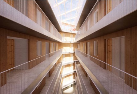 Les plantes d’habitatge s’organitzaran volumètricament al voltant d’un gran pati interior que comunicarà mitjançant passeres els habitatges, tot creant un espai comunitari diàfan de gran dimensió amb ventilació i il·luminació natural. Tots els habitatges disposaran de dos dormitoris, 51 d’ells amb dos dormitoris dobles i 13 amb un de doble i un de senzill. A més, comptaran amb ventilació creuada i balcó o terrassa a l’exterior.