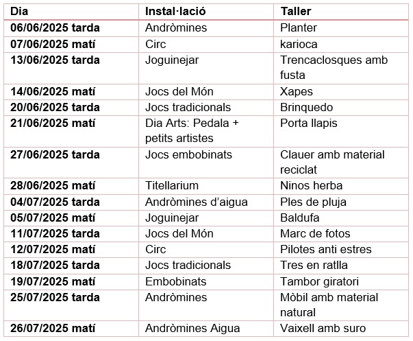 Les activitats que s’hi podran trobar a partir d’aquest dissabte seran fonamentalment jocs, activitats culturals, tallers de manipulació o creació artística així com petites actuacions artístiques que tenen com a públic principal els infants i les seves famílies.