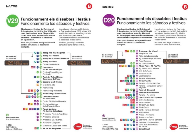 - Els dissabtes i festius, a partir del 7 de juny i durant l’estiu, les línies V29 i D20 tindran dues destinacions i fins a 8 autobusos articulats més per guanyar capacitat en el trajecte que porta al front marítim