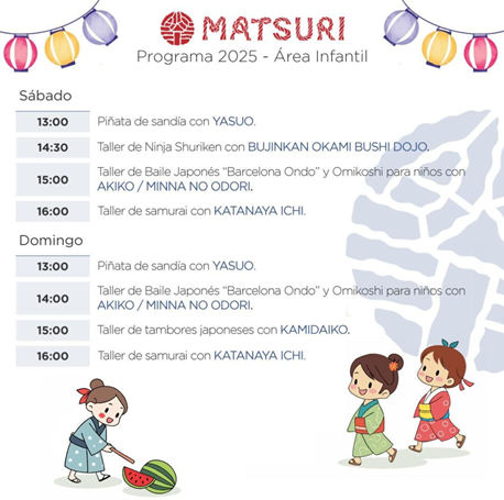 A més, no hi faltarà la gastronomia típica dels festivals japonesos: podràs tastar takoyaki, yakisoba i altres plats. També hi haurà parades amb ceràmica japonesa, matcha i productes tradicionals. Els més petits gaudiran tot el dia amb activitats a la zona infantil, pensada especialment per a famílies.