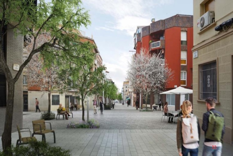 - Urbanització. Es planteja una nova secció en plataforma única amb una amplada d’entre 9,67 i 9.96 metres, i una banda de circulació de 3,50 metres. També s’incorporen passos laterals de vianants d’amplades que oscil·laran entre els 2 metres i els 4,2 metres. S’incorporarà també una franja amb arbrat a tot el llarg de l’eix, amb nou mobiliari i enllumenat.