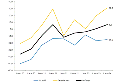 L’indicador determinant per explicar aquesta millora de la confiança comercial és el de les expectatives, que van a l’alça, 30’8 punts, (el 2023 va ser 19,7 punts) i compensen els valors de l’índex de situació actual que es manté en negatiu a finals del 2024 (-15,2 punts).