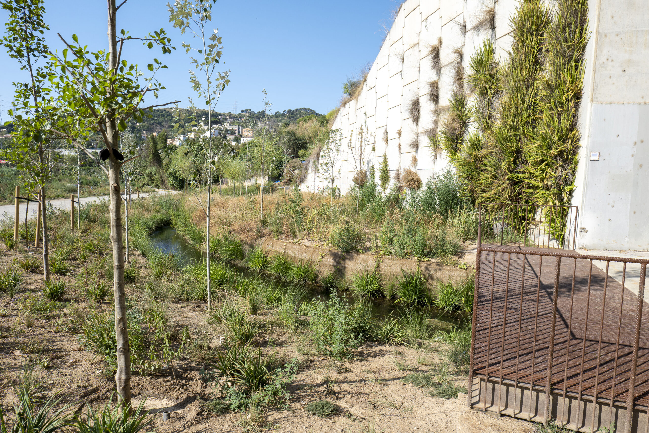 D’altra banda, per afavorir l’economia circular i minimitzar els residus, els murs a peu de talús s’han fet in situ a partir de les peces provinents de l’enderroc d’estructures obsoletes. També s’han aprofitat peces extretes del canal de formigó per afavorir l’apropament dels visitants a la barana que conforma el mirador dels horts. El mirador i el punt d’avistament del Rec que s’han disposat en aquest tram serviran com a fites paisatgístiques que posen en valor el patrimoni de l’ecosistema i, a més, actuen com a punts de trobada que rememora el valor social dels antics ponts.