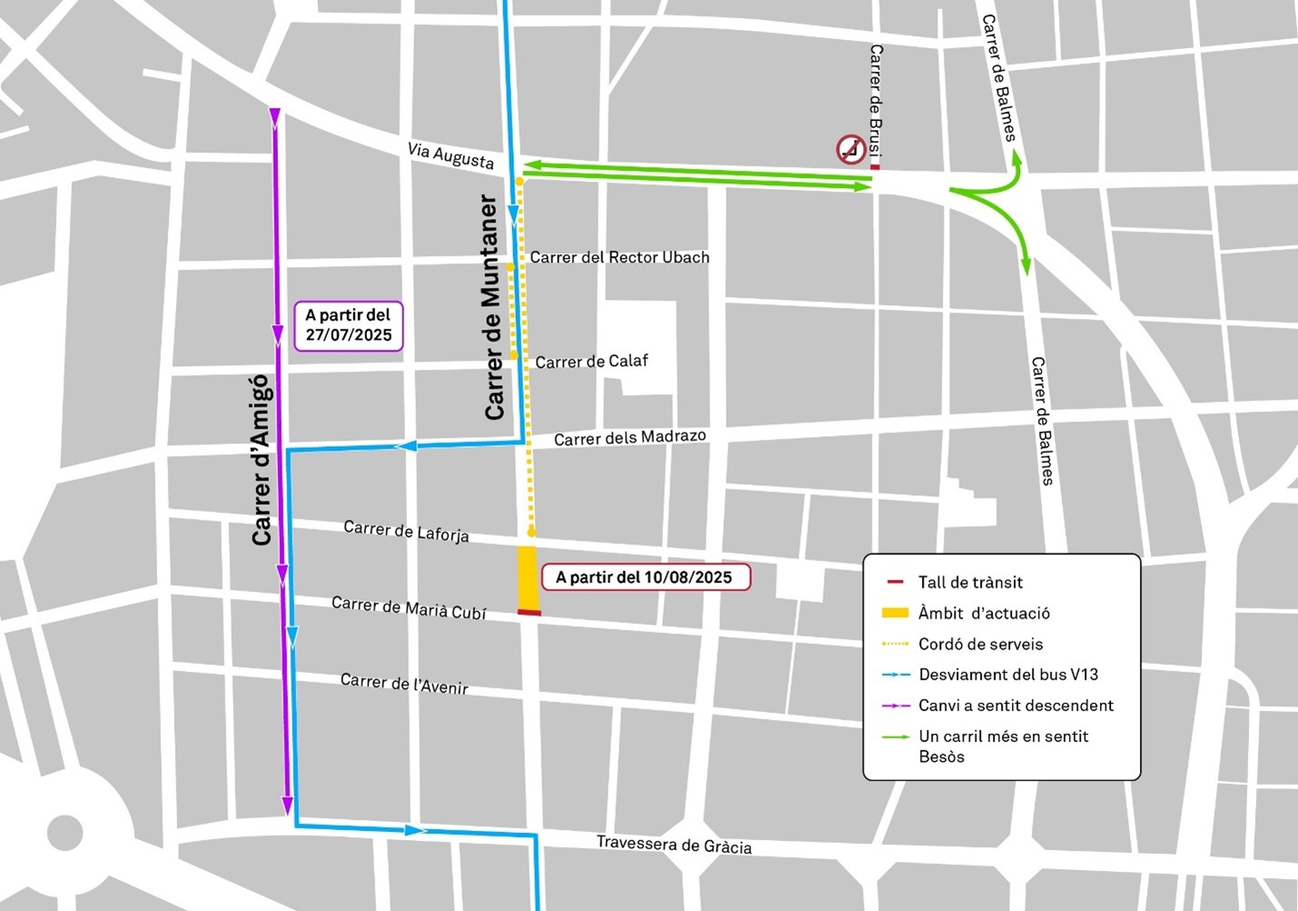 Com a mesura destacada, el carrer d’Amigó canviarà de sentit de circulació entre la Via Augusta i la travessera de Gràcia a partir del diumenge 27 de juliol. Aquesta actuació permetrà canalitzar millor el trànsit desviat pel tall de Muntaner i garantir la mobilitat de la zona, de manera que els vehicles que vinguin de la Via Augusta puguin girar en sentit mar per Amigó, abans d’arribar a Muntaner.