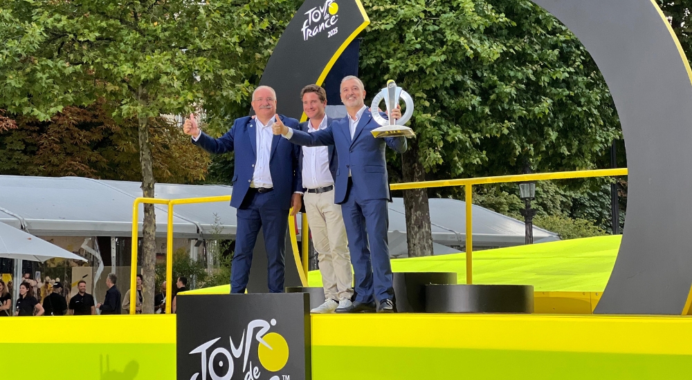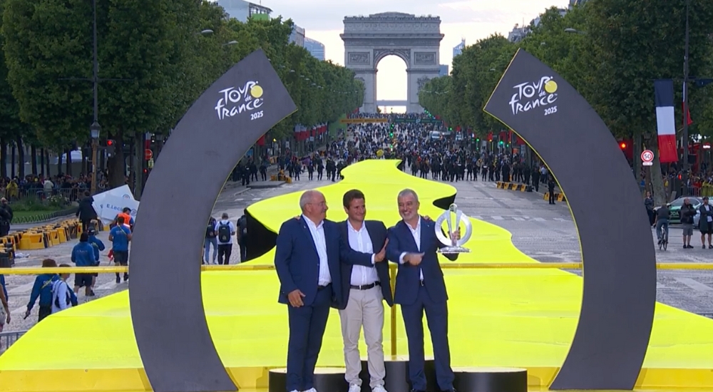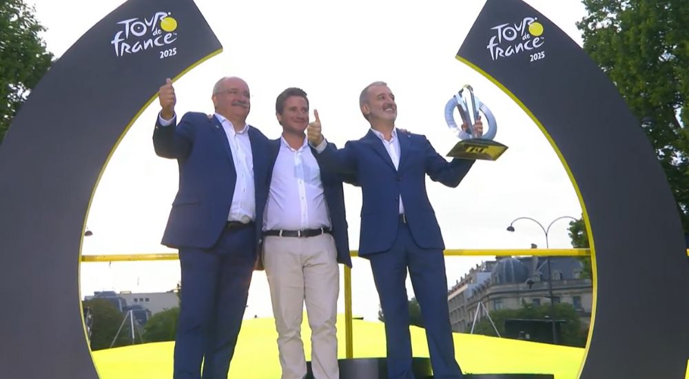 - El alcalde Jaume Collboni, presente en la etapa final de la competición ciclista más importante del mundo, ha recibido el trofeo de manos de Christian Poiret y Antoine Sillani, en un gesto que simboliza el relevo hacia Barcelona, ciudad que acogerá la salida del Tour el próximo año