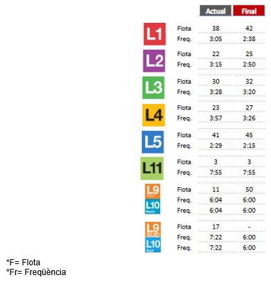 El pla de millores de freqüències amb aquesta compra suposarà que a l’L1 i l’L5 -que són les que porten més passatge- es passi dels 3 minuts (3:05) actuals a hora punta a L1 a 2:38 quan estiguin tots els trens. En el cas de l’L5 aquesta reducció seria dels 2:29 actuals als 2:15. També l’L2 que actualment té una freqüència de 3:15 -sempre en hora punta- baixarà dels 3 minuts al 2029, amb 2:50. Finalment, l’L3 i l’L4 baixaran el temps de pas de 3:28 a 3:20 i de 3:57 a 3:26.