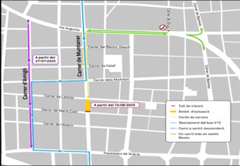 El tall afectarà l’itinerari habitual de la línia V13 de bus de TMB, que en sentit mar baixa per Muntaner. El bus baixarà per Muntaner fins al carrer de Madrazo per incorporar-se a Amigó fins a la travessera de Gràcia, per on anirà a recuperar l’itinerari habitual per Muntaner.