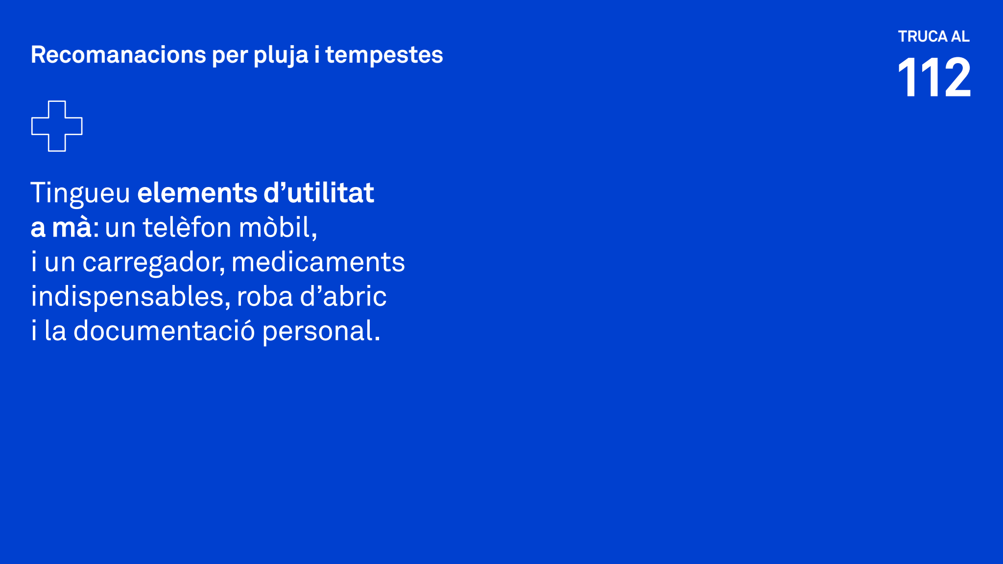 – Tingueu elements d’utilitat a mà: un telèfon mòbil i un carregador, medicaments indispensables, roba d’abril i la documentació personal