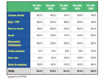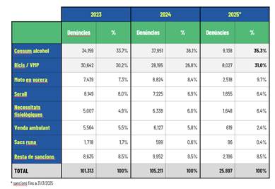 Les sancions més freqüents vinculades a l’ús de l’espai públic i a la convivència continuen sent les relacionades amb el consum d’alcohol, així com les per l’ús de bicicletes i vehicles de mobilitat personal. Durant els primers tres mesos de 2025, aquestes sancions representen el 66% del total de denúncies. Es manté més o menys estable el volum de sancions per soroll, o fer necessitats fisiològiques al carrer.
