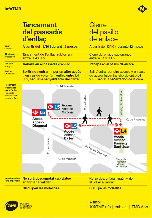 L’intercanviador que uneix les línies 4 i 5 a l’estació de metro de Verdaguer romandrà tancat des d’aquest dilluns 13 d’octubre i durant els propers 12 mesos per les obres d’accessibilitat al passadís d’intercanvi que permetran la substitució de les escales per rampes. L’eliminació d’aquestes barreres arquitectòniques obligarà les persones usuàries d’aquest enllaç a efectuar l’intercanvi entre línies pel carrer. Així, s’haurà de fer des de Passeig de Sant Joan —si l’intercanvi es fa des de l’L4 — i pel carrer Provença fins a la bocana de l’L5 situada a l’encreuament amb el carrer Bailèn, o de manera inversa si l’origen és l’L5. Tant a les sortides des de l’L4 i l’L5 com pel que fa a peu de carrer, els itineraris de l’enllaç estaran degudament senyalitzats i no serà descomptat cap viatge en tornar a validar.