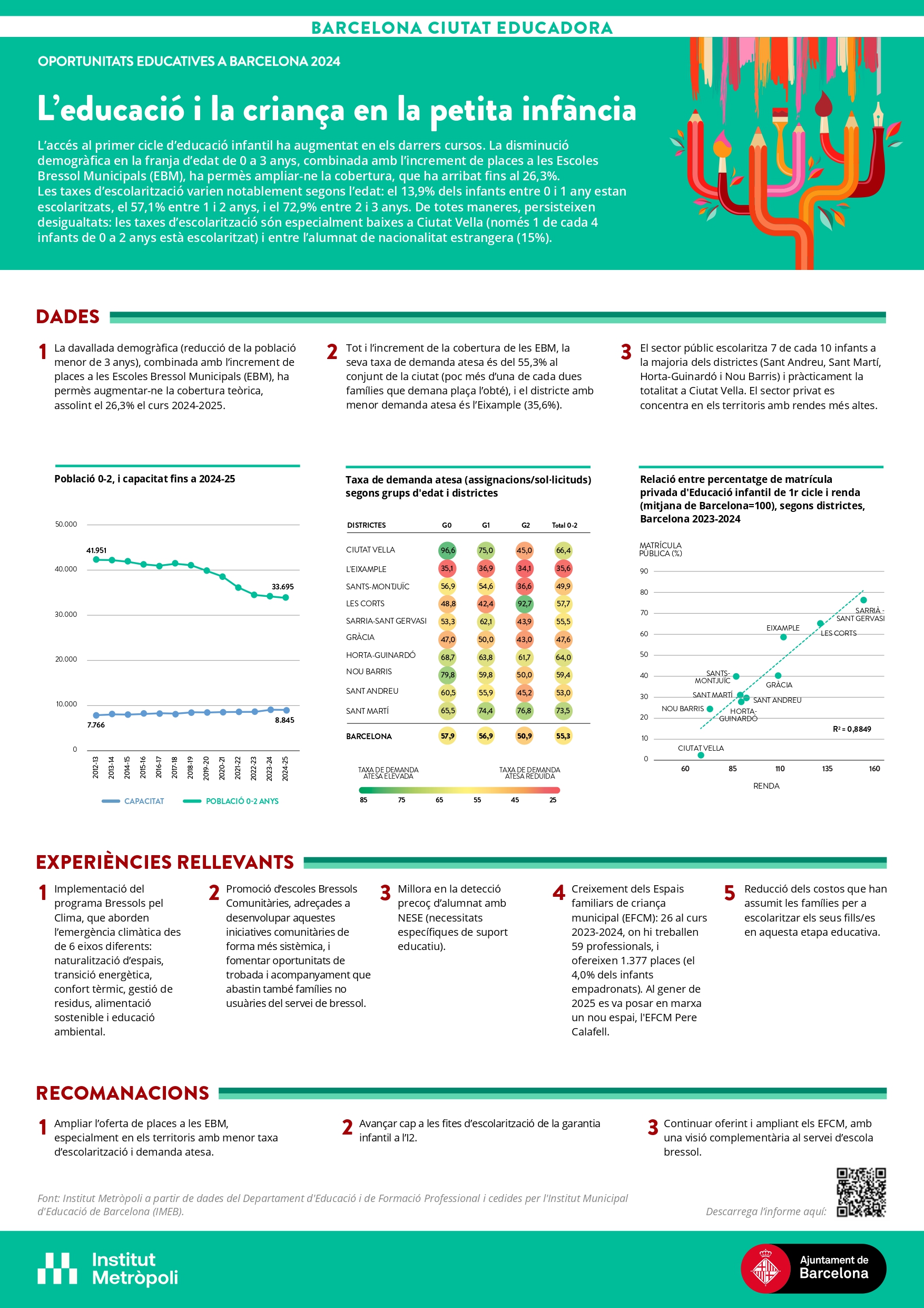 Un altre dels factors que ha contribuït a millorar l’equitat educativa és l’ampliació de la cobertura teòrica de l’escolarització del grup d’edat 0-3 anys, que ha passat del 18,5% del curs 2013-2014 al 26,3% del curs 2024-2025. Aquesta situació s’explica per la davallada demogràfica (amb la reducció de la població menor de 3 anys) combinada amb l’increment de places de la xarxa d’Escoles Bressol Municipal (EBM) que ha obert una desena d’escoles noves al llarg de l’última dècada (que corresponen a unes 1.000 places noves). En aquest sentit, l’Ajuntament de Barcelona manté una política activa pel que fa al creixement de la xarxa pública d’escoles de 0-3 anys. En aquests moments es troben en obres dues noves escoles bressol municipals (Can Carreras i Casernes) i està en marxa una tercera obra d’ampliació d’una de les escoles de la xarxa municipal, l’EBM La Mar. Tot i això, al conjunt de la ciutat, la taxa de demanda atesa de les EBM es va situar el curs 2024-2025 – segons les dades del mes de setembre, al tancament del procés de matriculació- entre el 65 i el 66%. Dit d’una altra manera: més de la meitat de les famílies que demanen plaça a una EBM poden efectivament matricular-s’hi.