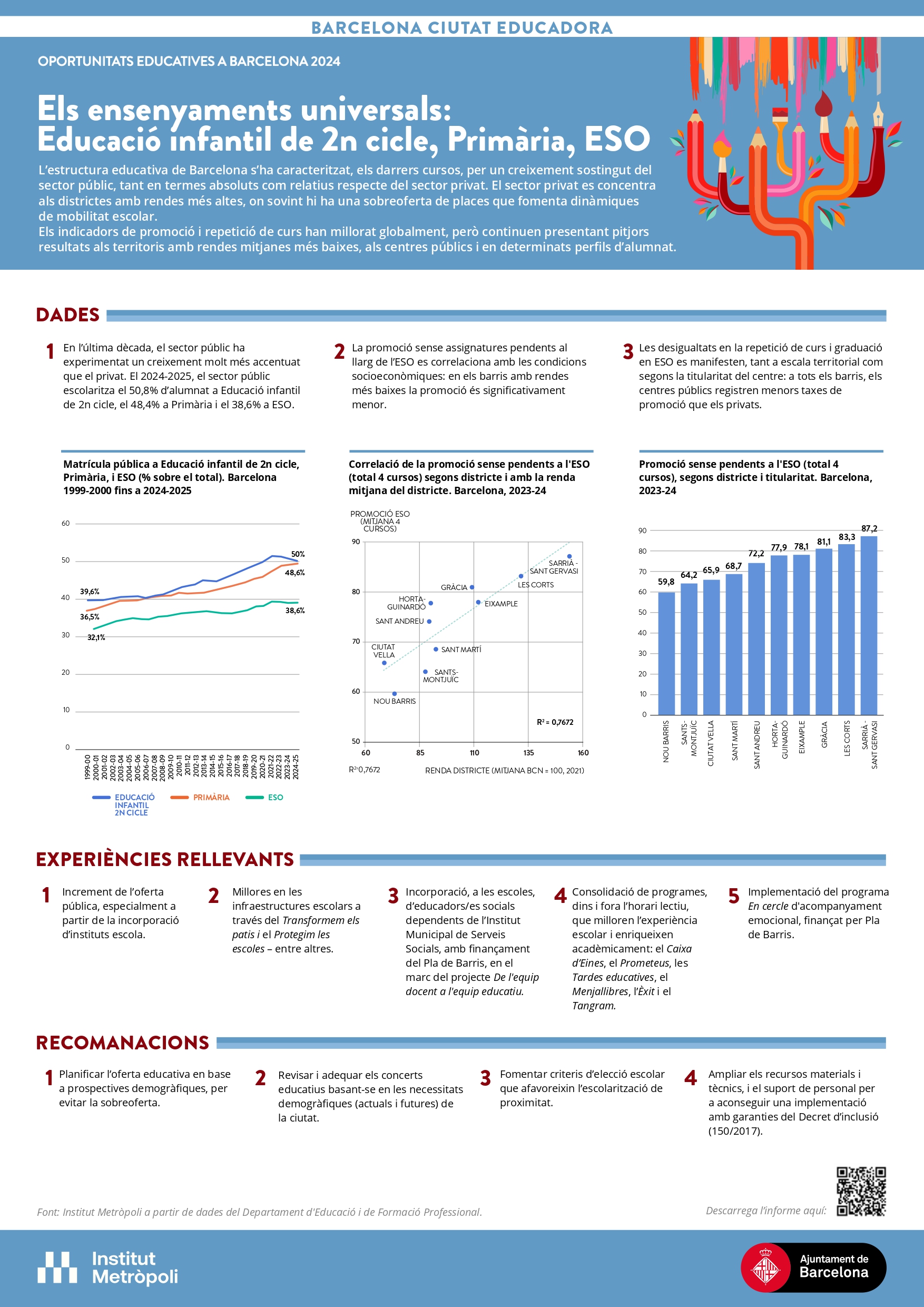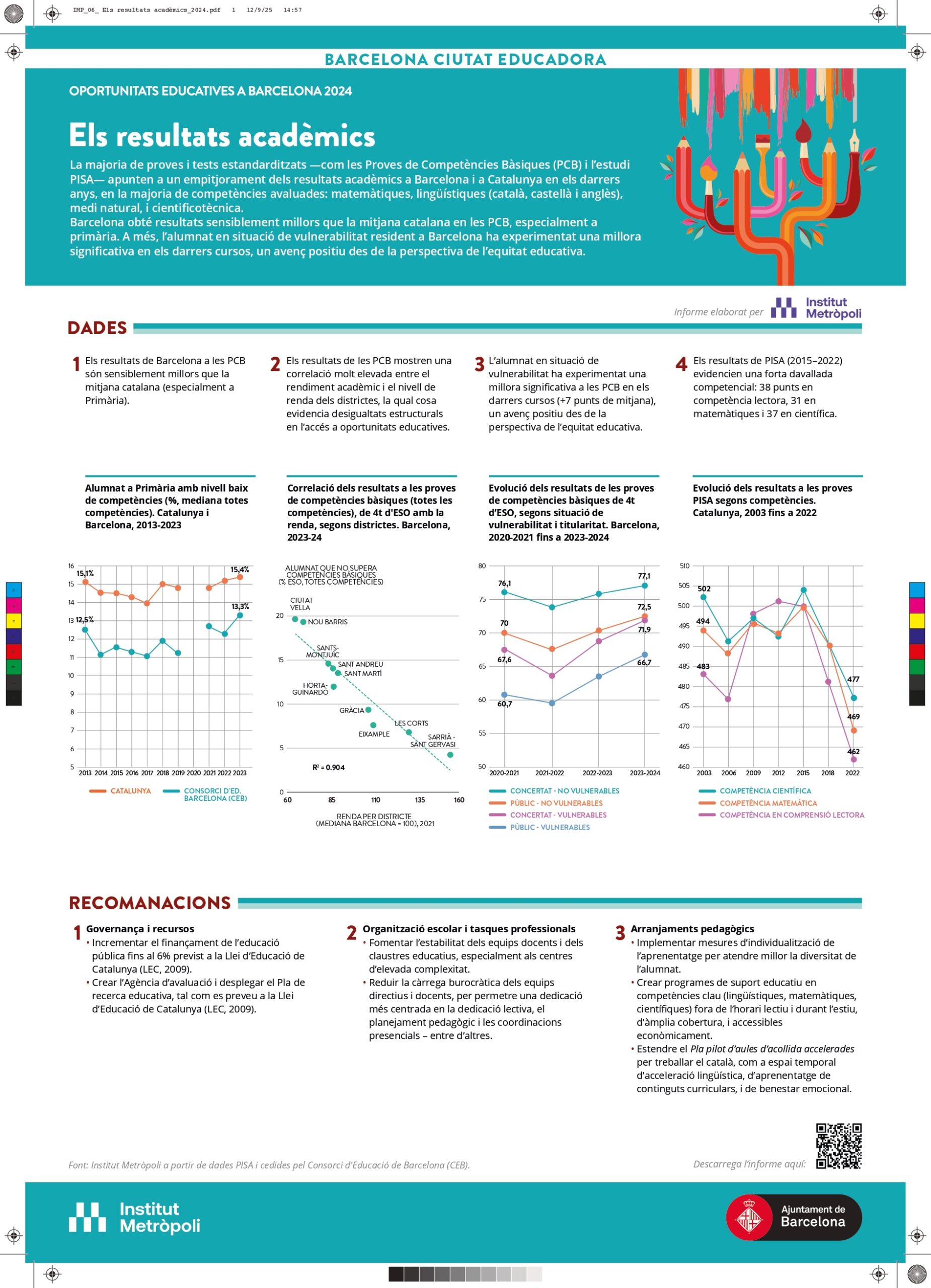 En aquest context, l’informe posa de manifest que la implementació de polítiques educatives orientades a l’accés i a l’equitat amplia les oportunitats educatives per a tothom i, alhora, millora els resultats acadèmics per a l’alumnat en situació de vulnerabilitat socioeconòmica. Aquesta és la tendència que es posa de manifest en aquest darrer informe: una millora clara en l’equitat educativa. Aquesta tendència s’evidencia en alguns dels resultats que s’observen en diferents etapes educatives. Per exemple, en la millora dels resultats acadèmics de l’alumnat en situació de vulnerabilitat socioeconòmica. També és destacable la reducció de la segregació escolar. Per altra banda, es produeix un creixement de la matrícula dels ensenyaments secundaris postobligatoris, sobretot de la Formació Professional (FP), combinada amb la reducció de l’abandonament escolar prematur. L’informe apunta també que en els darrers anys ha augmentat l’accés a l’educació infantil de primer cicle (acompanyat de l’increment de places de la xarxa d’escoles bressol municipal). I finalment i també és remarcable l’augment de la cobertura de les beques municipals per activitats extraescolars, considerant en aquest cas l’àmbit de l’educació més enllà del temps escolar i a llarg de la vida.