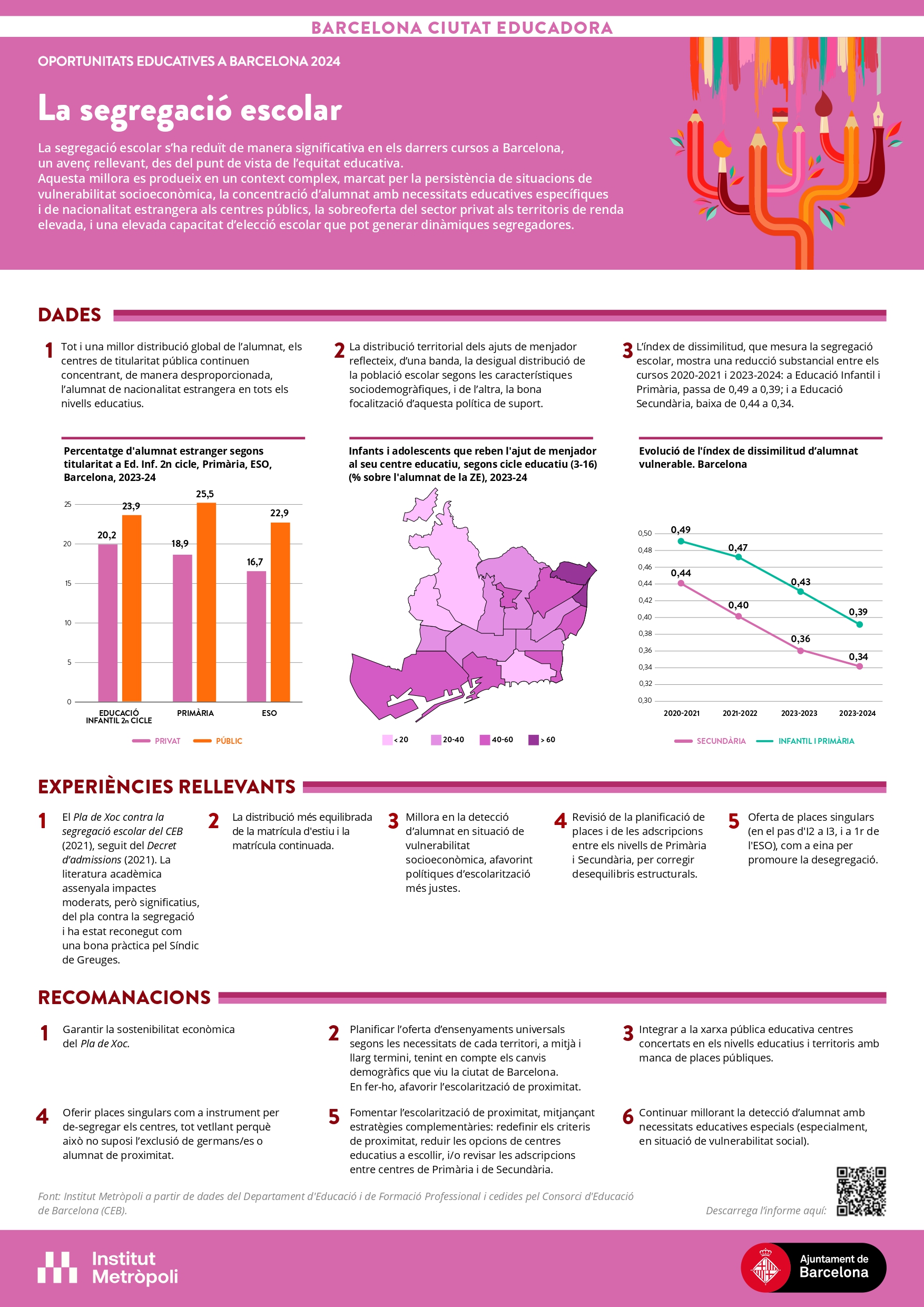 Un altre avenç destacat que mostra l’Informe d’Oportunitats Educatives és la reducció de la segregació escolar. L’índex de dissimilitud que la mesura, ha baixat de manera substancial entre els cursos 2020-2021 i 2023-2024: a educació infantil i primària, de 0,49 a 0,39; i a educació secundària, de 0,44 a 0,34. Aquesta reducció està vinculada al Pla de Xoc contra la segregació escolar impulsat pel Consorci d’Educació de Barcelona (2021) i del Decret d’admissions (2021), que han tingut impactes moderats, però significatius per reduir la segregació escolar i per millorar la inclusió social des de la infància, així com el sentit de pertinença al barri i a la ciutat.