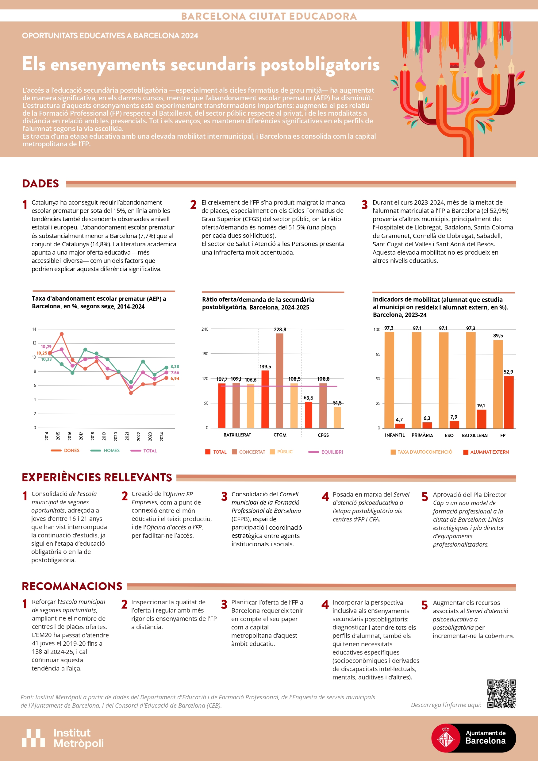 El bloc temàtic sobre ensenyaments secundaris postobligatoris de l’informe mostra l’augment de l’accés a l’educació secundària postobligatòria, sobretot als cicles formatius de grau mitjà. Aquest fet s’associa a la reducció de l’abandonament escolar prematur (AEP) en relació a les dades de fa una dècada, que es produeix tant a Catalunya (14,8% dels joves de 16 a 24 anys) com a Barcelona (7,7%). Això no obstant, l’estudi constata que persisteix la manca de places, sobretot en els Cicles Formatius de Grau Superior (CFGS) públics, amb una ràtio d’oferta respecte a la demanda del 51,5% (una plaça per cada dues sol·licituds). I mostra que la situació és especialment crítica en l’àmbit de Salut i Atenció a les Persones. Això no obstant, aquest curs 2025-2026 s’ha impulsat el reforç de l’oferta formativa dels estudis precisament del camp de la salut i les cures, amb la posada en marxa de l’Institut d’FP Sanitària Sant Pau, i amb l’ampliació de l’oferta d’FP a l’Institut Hospital del Mar FP Sanitària, arran de l’obertura d’una nova seu al carrer Almogàvers que inclou especialitats de l’àmbit sanitari i de l’àmbit de serveis socioculturals i a la comunitat.