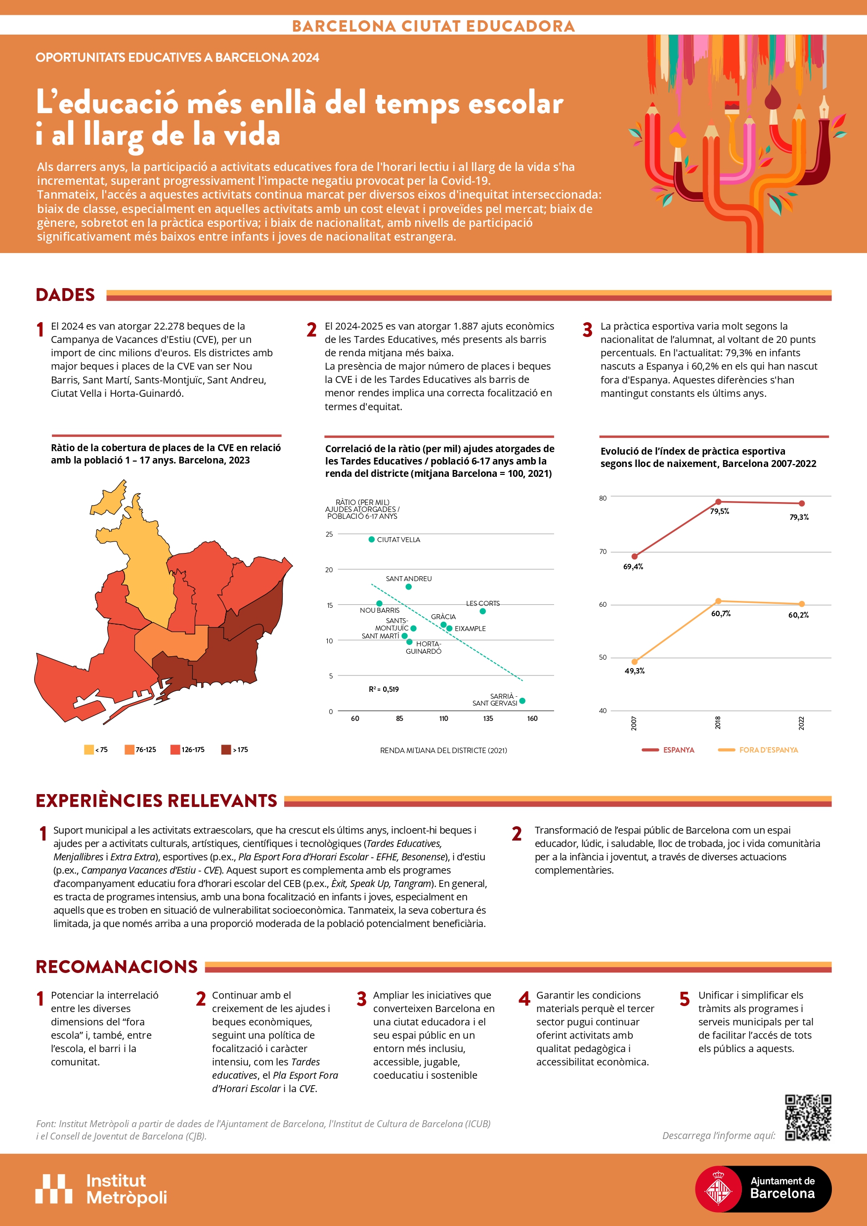 En l’àmbit temàtic de l’Educació més enllà del temps escolar i al llarg de la vida, l’estudi aporta dades sobre l’increment de la participació en activitats educatives fora de l’àmbit escolar. En paral·lel, l’Ajuntament de Barcelona ha continuat oferint ajudes econòmiques per a activitats extraescolars, amb 22.278 beques atorgades a la Campanya de Vacances d’Estiu (CVE), 17.534 per extraescolars esportives, i 1.887 a les Tardes Educatives. Aquest suport, destinat sobretot a famílies en situació de vulnerabilitat socioeconòmica, ha contribuït a recuperar l’accés a activitats extraescolars després de la caiguda provocada per la pandèmia.