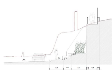 - La zona, coneguda com a coll d’ampolla, es caracteritza pel pendent pronunciat, amb talussos que delimiten el traçat del carrer, i voreres estretes
