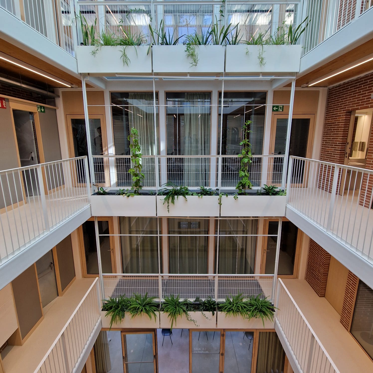 A les zones que s’han conservat, s’han recuperat materials originals existents com el paviment, alguns enteixinats, arrambadors ceràmics i les fusteries originals. En els nous espais s’han buscat materials càlids, d’origen natural i baix impacte ambiental per a generar entorns saludables per als usuaris i afavorir la sostenibilitat de l’edifici.