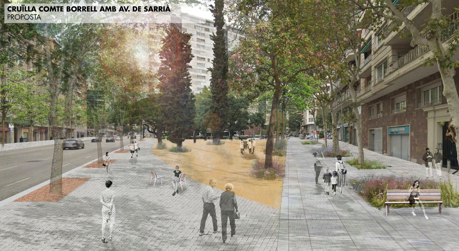 També en aquest mateix àmbit, però fora de la MPGM, es planifica la pacificació del Carrer Borrell entre els carrers de París i Londres, així com les ampliacions de voreres d’Urgell i Avinguda Sarrià.