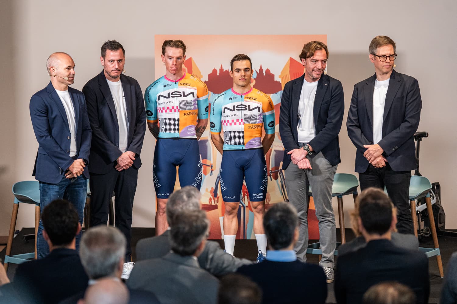 A l’acte oficial també s’ha presentat el nou mallot oficial de l’equip i ha comptat amb la presència, entre d’altres, de Joel Borràs i Andrés Iniesta, cofundadors de l’agència NSN; Jaume Sabater, CEO de Stoneweig; Kjell Carlström, director de l’equip i Biniam Girmay, ciclista del NSN Cycling Team.