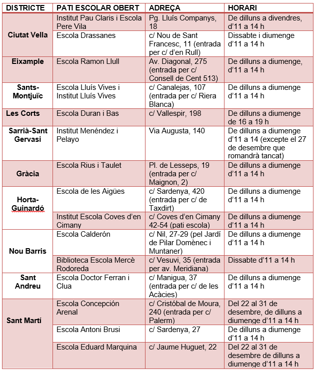 - Els patis d’escoles obren del 22 de desembre al 7 de gener, exceptuant els dies 25 i 26 de desembre i 1 i 6 de gener