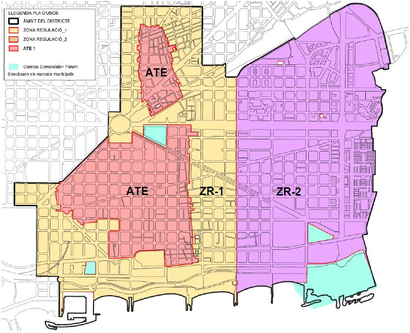 Per preservar l’Àrea de Tractament Especial (ATE) que conformen aquests carrers i el seu entorn pròxim i evitar la concentració del nombre d’activitats en horari nocturn, el Pla permet que en una altra part del districte, les Zones de Regulació ZR-1 i ZR-2, hi hagi una nova implantació en horari nocturn, regulada des del seu inici pel Pla d’Usos.